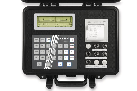 Display device with integrated thermal transfer printer and rechargeable battery pack in stable, lined transport case. 6 quick-release connectors to connect up to 6 weighing pads. The weighing results from the individual weighing pads can be issued individually or cumulatively